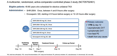 研究纳入年龄≥ 40周岁且< 80周岁、自愿接受择期单侧全膝关节置换术治疗的男性或女性,随机分配至试验组或阳性对照组。试验组在术后4~8小时接受SHR-2004 60 mg、120 mg、240 mg单次皮下注射(SC)或SHR-2004 90 mg单次静脉滴注(IV);对照组为依诺肝素40 mg每日一次皮下注射,于术前1天晚上(距手术开始≥12 h)或术后12-24 h给药,至少持续治疗至完成主要终点访视疗效影像学评估。